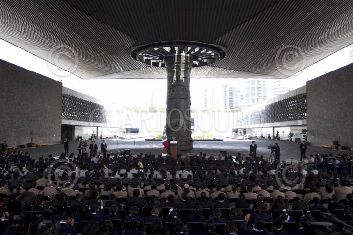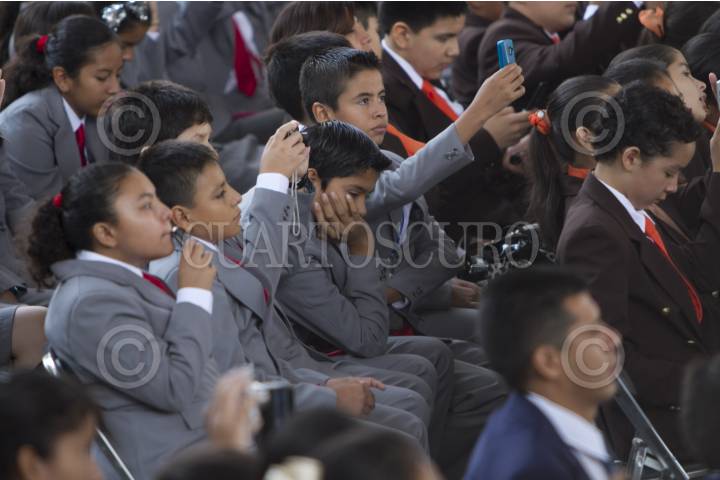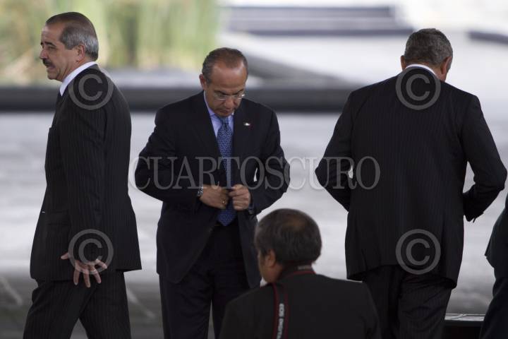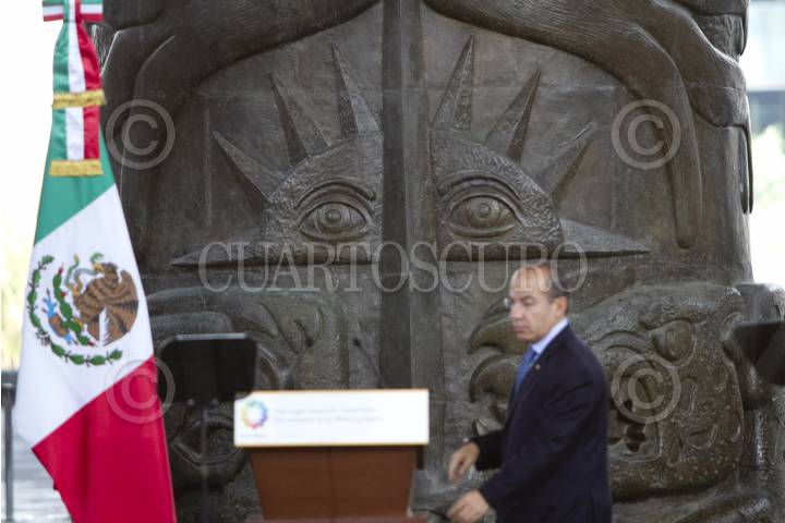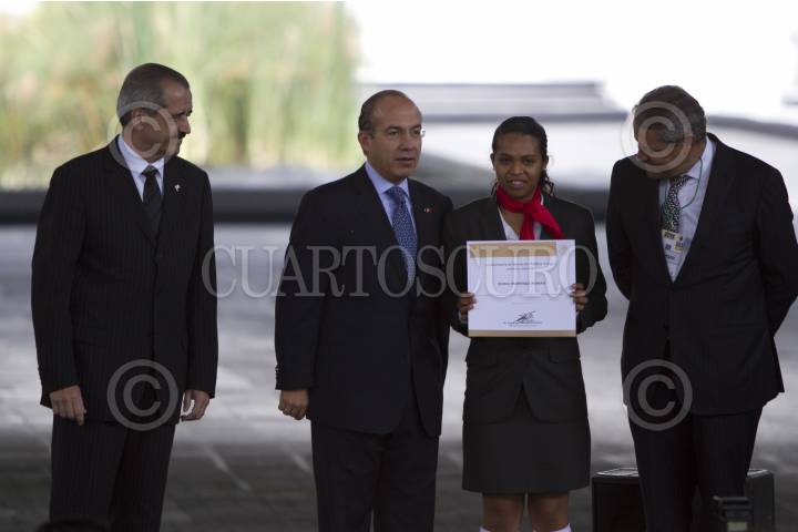 MÉXICO D.F., 23JULIO2012.- Felipe Calderón Hinojosa, Presidente de México, acompañado de Luis Robles Miaja, vicepresidente del Consejo de Administración del Grupo Financiero BBVA Bancomer y José Ángel Córdova Villalobos, titula de la Secretaría de Educación Publica encabezo la ceremonia de Premiación del Concurso Olimpiada del Conocimiento Infantil 2012 en el Museo de Antropología e Historia. FOTO: GUILLERMO PEREA /CUARTOSCURO.COM