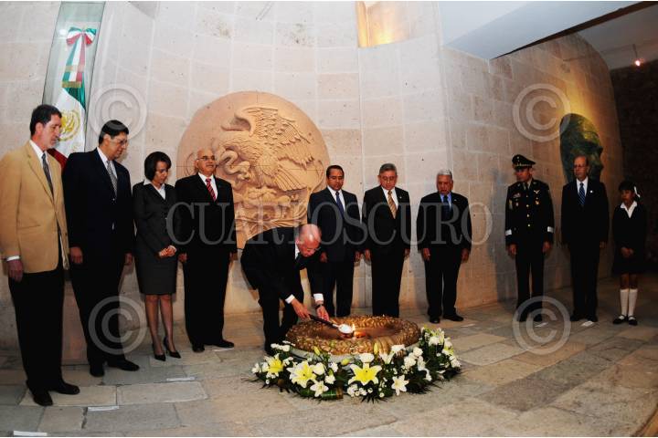 GUANAJUATO, GUANAJUATO, 28OCTUBRE2009.- Nicéforo Hernández Guerrero, presidente municipal de Guanajuato, Juán Manuél Oliva Gobernador del estado, y José Narro Robles, Rector de la Universidad Nacional Autónoma de México (UNAM), invitado, es el encargado de encender el Fuego Simbólico de la Libertad, en la Rotonda de los Héroes de Independencia, ubicada en el interior de la Alhóndiga de Granaditas. Esto a menos de un año del Bicentenario de la Independencia y Centenario de la Revolución Mexicana. FOTO: DAVID BOLAÑOS/CUARTOSCURO.COM