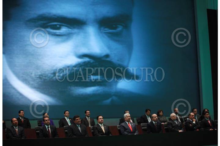 MÉXICO, D.F., 10FEBRERO2010.- Leonel Godoy, Juan Manuel Oliva, Héctor Israel Ortíz Ortíz, Carlos Navarrete, Presidente del Senado de la República, Francisco Ramírez Acuña, Presidente de la Cámara de Diputados, Felipe Calderón Hinojosa, Presidente de México, Guillermo Ortíz Mayagoitia, Presidente de la Suprema Corte de Justicia de la Nación, Marco Antonio Adame, Rodrigo Medina de la Cruz, Gobernadores de Michoacan, Guanajuato, Tlaxcala, Morelos y Nuevo León, durante la presentación del programa de actividades a seguir para los Festejos del Bicentenario de la Independencia y Centenario de la Revolución Mexicana, FOTO: ALFREDO GUERRERO/CUARTOSCURO.COM