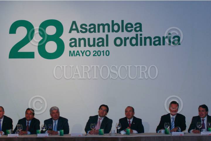 MÉXICO, D.F., 04MAYO2010.- Felipe Calderón Hinojosa, presidente de México en el pleno de la XXVIII Asamblea Ordinaria del Consejo Coordinador Empresarial, lo acompañan Juan Manuel Oliva, gobernador del Estado de Guanajuato, Francisco Acuña; presidente de la mesa directiva de la Cámara de Diputados, Armando Paredes Arroyo Loza, Mario Sánchez Ruiz y Gerardo Ruiz; Secretario de Hacienda, que se celebro en un conocido hotel lujoso de la zona de Polanco. FOTO: MARCO POLO GUZMÁN HERNÁNDEZ/CUARTOSCURO.COM