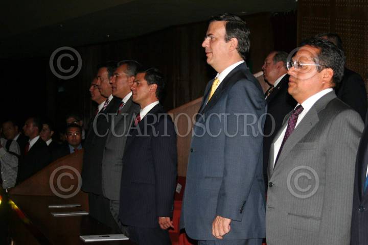 MÉXICO, D.F., 22SEPTIEMBRE2010.- José Calzada Rovirosa, Humberto Moreira, Marco Antonio Adame, Enrique Peña Nieto, Marcelo Ebrard Casaubon y Juan Manuel Oliva, gobernadores de Queretaro, Coahuila, Morelos, Estado de México, Distrito Federal y Guanajuato, respectivamente, asistieron a la celebración del 100 aniversario de la Universidad Nacional Autónoma de México (UNAM), realizado en la sala Nezahualcóyotl del Centro Cultural Universitario, hoy miércoles 22 de septiembre de 2010. FOTO: CUARTOSCURO.COM