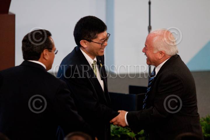 MÉXICO, D.F., 17JUNIO2011.- Juan Manuel Oliva, gobernador de Guanajuato y Antonio Ramírez Vallejo, presidente municipal de Salamanca, conversando con un inversionista japones de la compañía Mazda, durante el anuncio de inversión por 500 millones de dólares que esta empresa automotriz invertirá en la construcción de una planta de vehículos y motores en Salamanca, Guanajuato, en conjunto con la empresa Sumitomo Corporation. FOTO: MOISÉS PABLO/CUARTOSCURO.COM