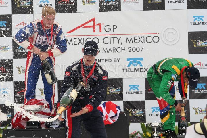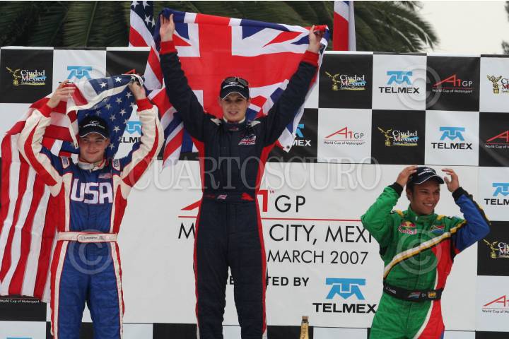 MÉXICO, D.F., 25MARZO2007.- El piloto inglés Oliver Jarvis, terminó en primer lugar, seguido del norteamericano Jonathan Summerton y el sudafricano Adrian Zaugg, en la serie A1 GP, la cual se realizó que el autódromo Hermanos Rodríguez. FOTO: ISAAC ESQUIVEL/CUARTOSCURO.COM
