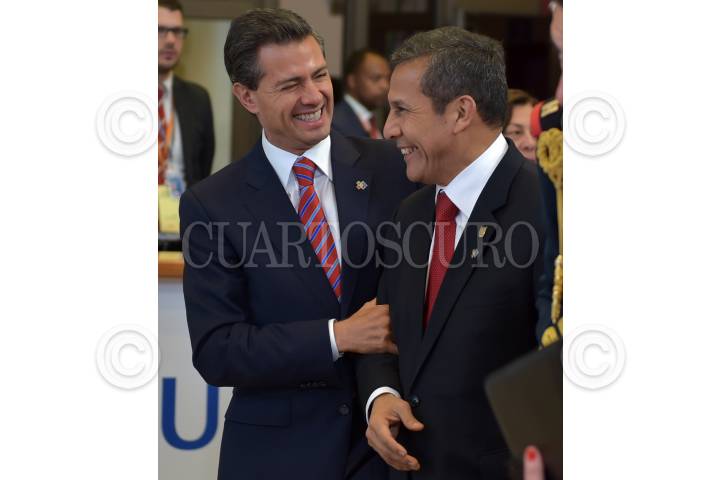 BRUSELAS, BÉLGICA, 11JUNIO2015.- El Presidente Enrique Peña Nieto saludó a su homólogo de la República del Perú, Ollanta Humala Tasso, al encontrarse durante la II Cumbre UE-CELAC que se desarrolló los días 10 y 11 en esta ciudad. FOTO: PRESIDENCIA /CUARTOSCURO.COM