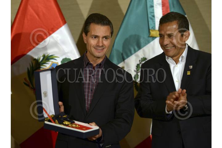 PARACAS, PERÚ, 02JULIO2015.- El Gobierno de la República del Perú entregó al Presidente Enrique Peña Nieto, la “Orden Militar Francisco Bolognesi” y la “Orden Gran Almirante Grau”, ambas en Grado de Gran Cruz. En el acto, atestiguado por el Presidente peruano, Ollanta Humala Tasso, el Primer Mandatario mexicano dijo que ambos países “estamos trabajando para ensanchar las rutas que permitan que las políticas que seguimos ayuden a que nuestras sociedades tengan mejor porvenir y mayor prosperidad”. FOTO: PRESIDENCIA /CUARTOSCURO.COM