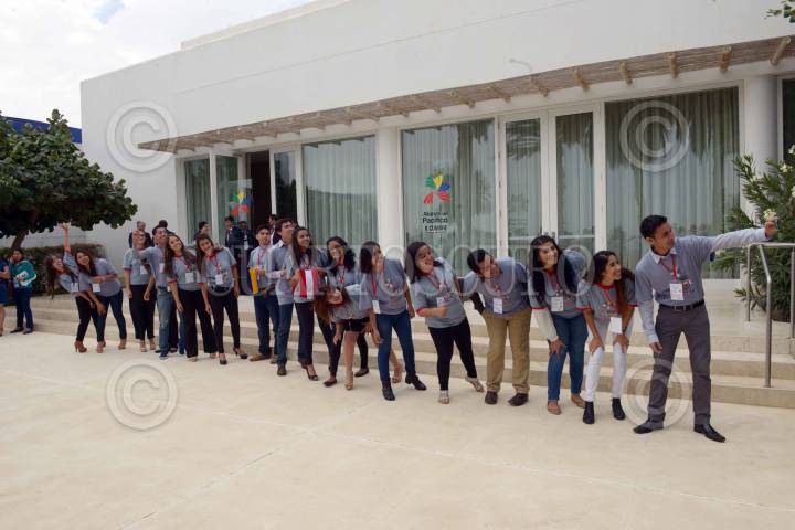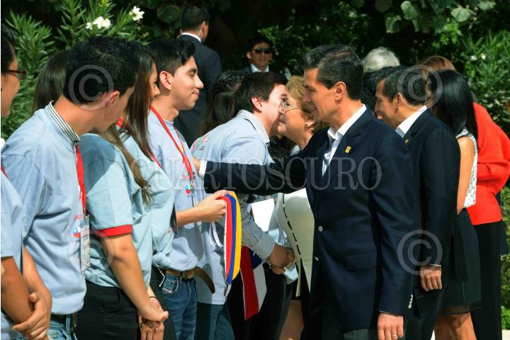 PARACAS, PERÚ, 03JULIO2015.- El Presidente Enrique Peña Nieto, previo a su participación en la sesión plenaria de la Décima Cumbre de la Alianza del Pacífico, en compañía de sus homólogos de Chile, Michelle Bachelet, y de la República del Perú, Ollanta Humala Tasso, saludaron a jóvenes estudiantes beneficiarios de la beca de la Alianza del Pacífico, plataforma de movilidad estudiantil y académica, que estudian en Perú. FOTO: PRESIDENCIA /CUARTOSCURO.COM