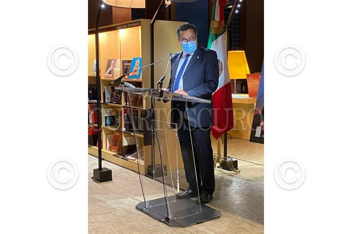 Emmanuel Kasarhérou, presidente del Museo del Quai Branly-Jacques Chirac, dando un discurso en la inaguración de la exposición: Los olmecas y las culturas del Golfo de México.