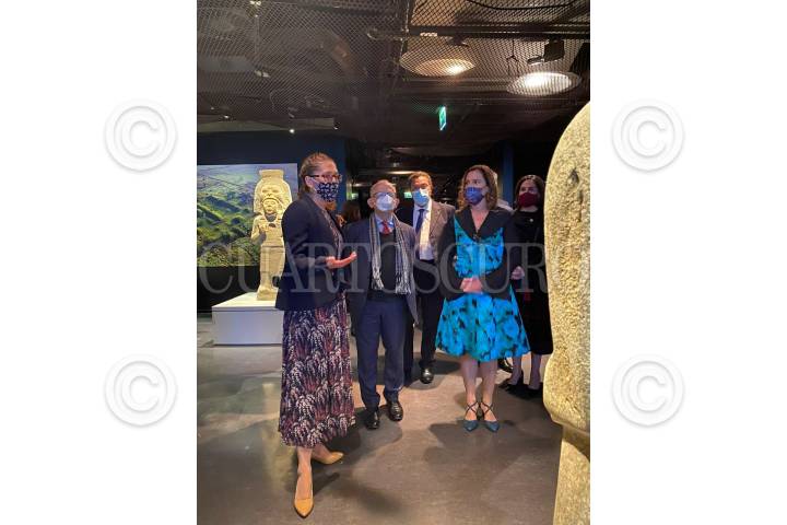 Cora Falero Ruiz, asesora científica de la exposición, brindando un recorrido de la exposición a Beatriz Gutiérrez Müller, presidenta del Consejo Asesor Honorario de la Coordinación de Memoria Histórica y Cultural de México, Diego Prieto Hernánde