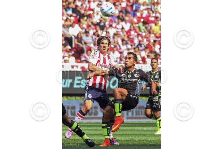 GUADALAJARA, JALISCO, 17AGOSTO2014.- Las Chivas del Guadalajara se enfrentan a Santos Laguna en el partido correspondiente a la Jornada 5 del Torneo de Apertura 2014 de la Liga MX donde el marcador al medio tiempo es de empate a cero goles. En la imagen el jugador del Chivas Carlos Fierro disputa un balón frente al contrario del Santos, Adrián Aldrete. FOTO: FERNANDO CARRANZA GARCIA/CUARTOSCURO.COM