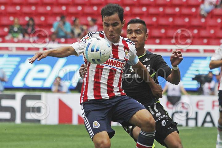 GUADALAJARA, JALISCO, 17AGOSTO2014.- Las Chivas del Guadalajara se enfrentan a Santos Laguna en el partido correspondiente a la Jornada 5 del Torneo de Apertura 2014 de la Liga MX donde el marcador al medio tiempo es de empate a cero goles. En la imagen el jugador de Chivas, Omar Bravo disputa un balón frente al contrario del Santos, Rodolfo Salinas. FOTO: FERNANDO CARRANZA GARCIA/CUARTOSCURO.COM