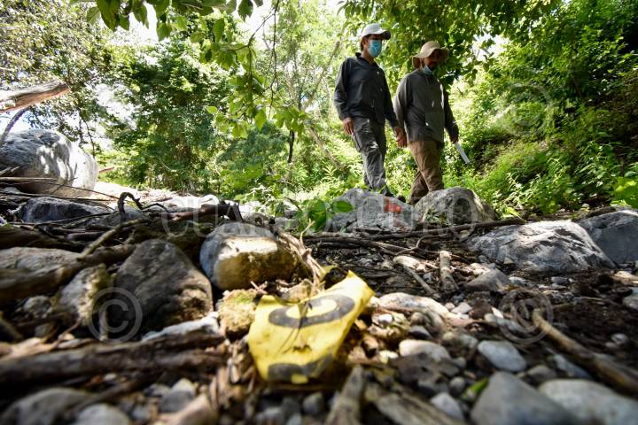 Elementos de la fiscalía de Guerrero resguardan la zona conocida como "La barranca de la Carnicería" donde Alejandro Encinas y Omar Gómez Trejo realizaron un recorrido acompañados de medios de comunicación.