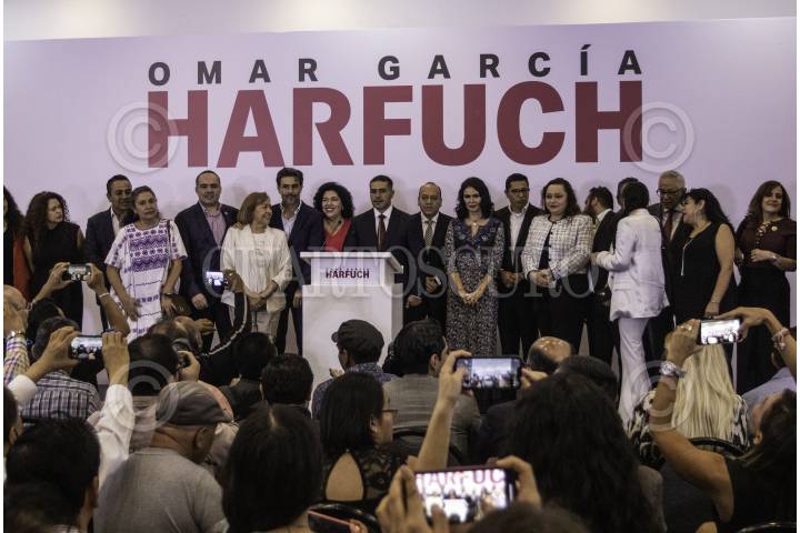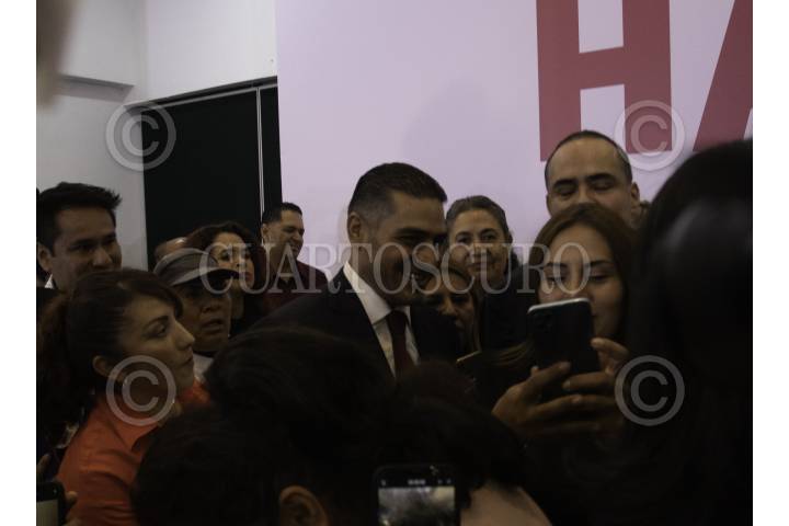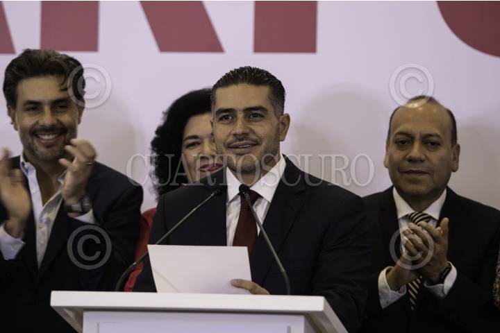 CIUDAD DE MÉXICO, 28SEPTIEMBRE2023.- Sebastián Ramírez, dirigente nacional de Morena, y Francisco Chíguil, consejero estatal de Morena, anunciaron que por unanimidad Morena eligió a Hugo López-Gatell, Clara Brugada, Omar Harfuch, y Mariana Boy, como sus precandidatos para encabezar la Coordinación de la Defensa de la Cuarta Transformación en la Ciudad de México, esto durante su consejo. FOTO: MORENA CDMX/CUARTOSCURO.COM