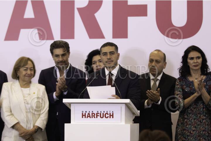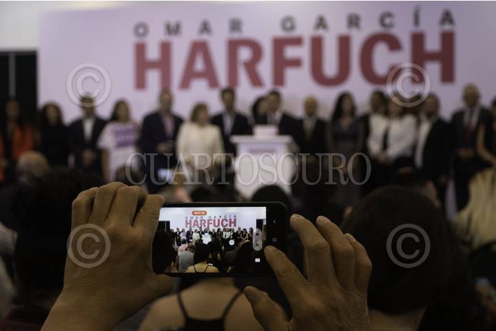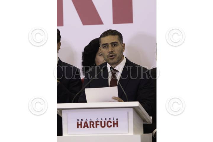 CIUDAD DE MÉXICO 20SEPTIEMBRE2023.- Omar García Harfuch, ex titular de la Secretaría de Seguridad Ciudadana (SSC), anunció mediante conferencia de prensa que buscará la candidatura de Morena para la Jefatura de Gobierno de la Ciudad de México en las elecciones de 2024. Clara Brugada y él son los aspirante para la candidatura por parte de Morena. FOTO: ANDREA MURCIA /CUARTOSCURO.COM