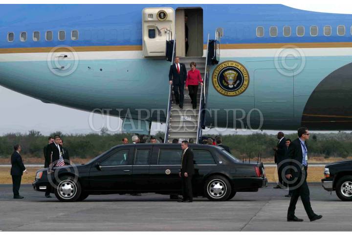 Monterrey, Nuevo León 12 ENERO 2004.- El Presidente George Bush y su esposa Laura Bush, bajan del avión One Force Air al llegar al aeropuerto de la ciudad, para participar en la Cumbre de las Américas. FOTO: Pedro Valtierra/CUARTOSCURO.COM