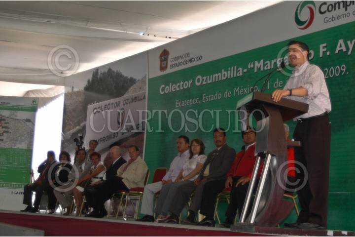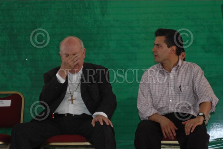 ECATEPEC, ESTADO DE MÉXICO, 11JUNIO2009.- Monseñor Onésimo Cepeda Silva, Obispo de Ecatepec, durante la inauguración del Colector Ozumbilla-"Margarito F. Ayala", en el que estuvo Enrique peña Nieto, gobernador del estado de México y David Korenfeld Federman, secretario del Agua y Obra Pública del Gobierno del Estado. Durante la intervención del funcionario estatal se acercó al ejecutivo y después le devolvió el lugar. Al evento autoridades del ayuntamiento de Ecatepec no fueron invitados pese a que la actual administración gestionó ante el Fondo Metropolitano la obra de tres colectores. FOTO: MARIO NULO/CUARTOSCURO.COM