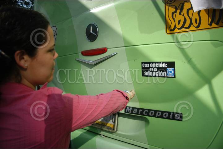 MÉXICO D.F. 18ABRIL2007.-Mariana Gómez del Campo dirigente del partido acción nacional (PAN) en el D.F. pega una calcomonía en la parte trasera de un microbús con la leyenda "Otra Opción es la Adopción" esto como una forma de manifestarse en contra de la aprobación del aborto. FOTO: GUILLERMO PEREA/CUARTOSCURO.COM