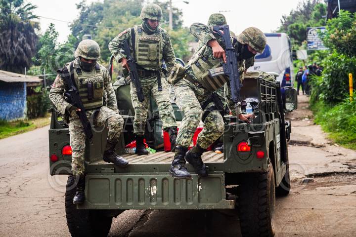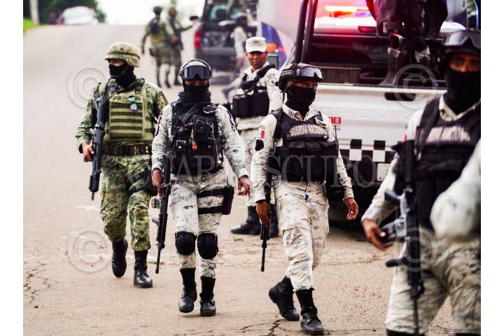 BUENAVISTA TOMATLÁN, MICHOACÁN, 13SEPTIEMBRE2023.- Tras un tercer ataque con drones sufrió la tenencia de La Ruana, la mañana de este miércoles, en un momento en el que la tensión reina en la zona por la conformación de un grupo de civiles armados que intenta organizar un grupo de autodefensas, contra el grupo delictivo de Los Viagras. Por su parte el gobierno sigue con los operativos en la localidad de La Ruana con elementos de la secretarías de Seguridad Pública (SSP) y de la Defensa Nacional (Sedena), así como, de la Guardia Nacional (GN). Elementos de la Fiscalía General del Estado (FGE), siguen buscando las casas de seguridad del Cártel de Los Viagras. FOTO: JUAN JOSÉ ESTRADA SERAFÍN /CUARTOSCURO.COM