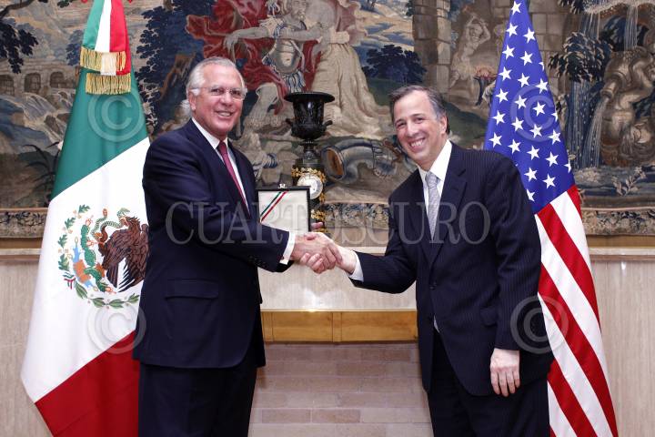 MÉXICO, D.F., 18FEBRERO2015.- El canciller José Antonio Meade Kuribreña entregó la Condecoración de la Orden Mexicana del Águila Azteca, en grado de placa, a Richard W. Fisher, presidente y director del Banco de la Reserva Federal de Dallas. La ceremonia, realizada en la sede del Banco de México, contó con la participación del gobernador de esta institución autónoma, Agustín Carstens, y de Anthony Wayne, embajador de los Estados Unidos en México. FOTO: SRE /CUARTOSCURO.COM