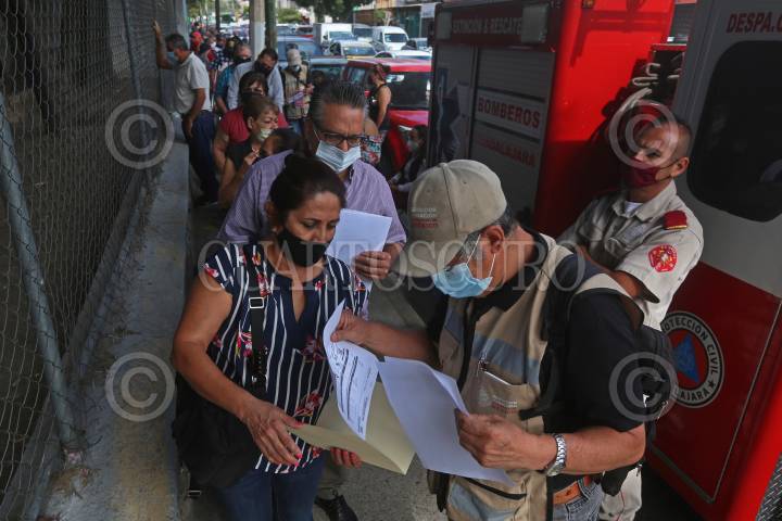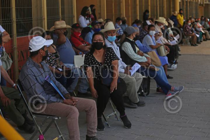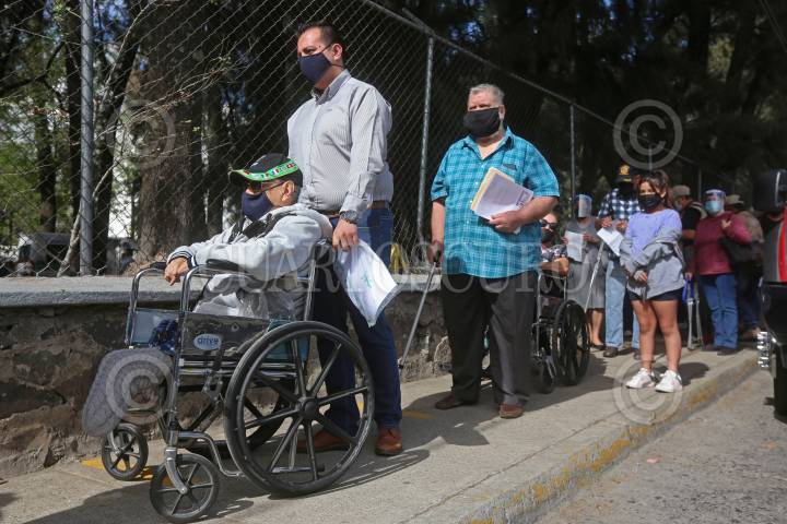 Personas de edad adulta hacen fila para que servidores de la nación revisen la documentación y posteriormente ser vacunados contra el Covid-19.