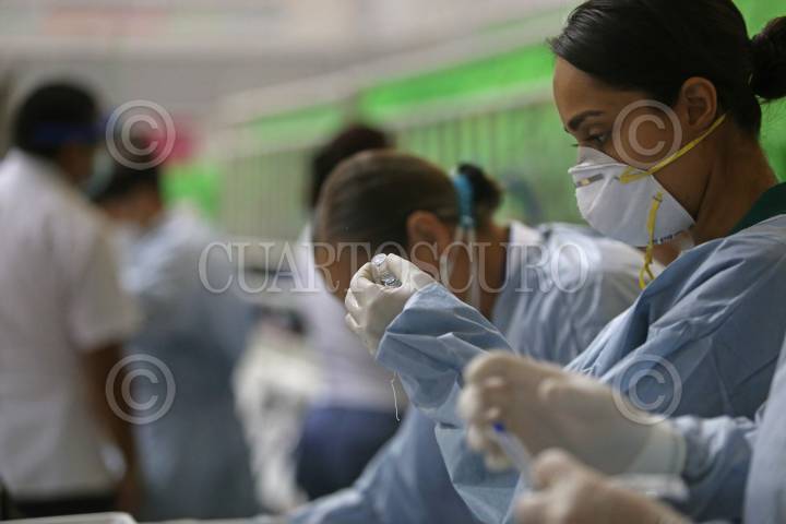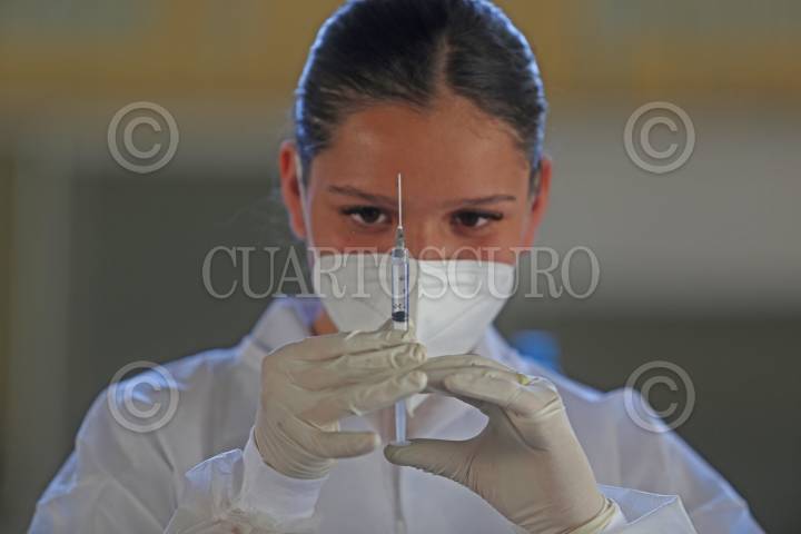 Personal encargado de la inmunización, preparan las dosis de la vacuna contra Covid-19 para posteriormente ser aplicadas a personas de la tercera edad.