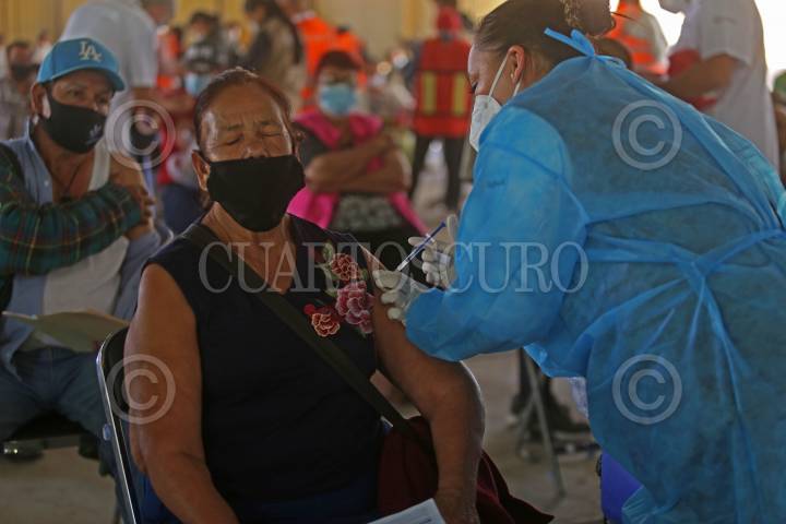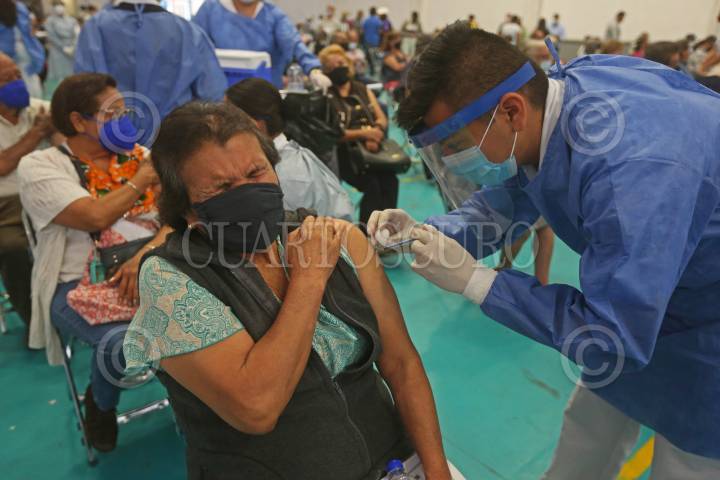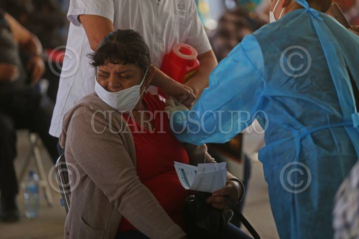 Personal encargado de la inmunización, aplica la vacuna contra Covid-19 a una mujer de la tercera edad en el modulo del Parque San Rafael.