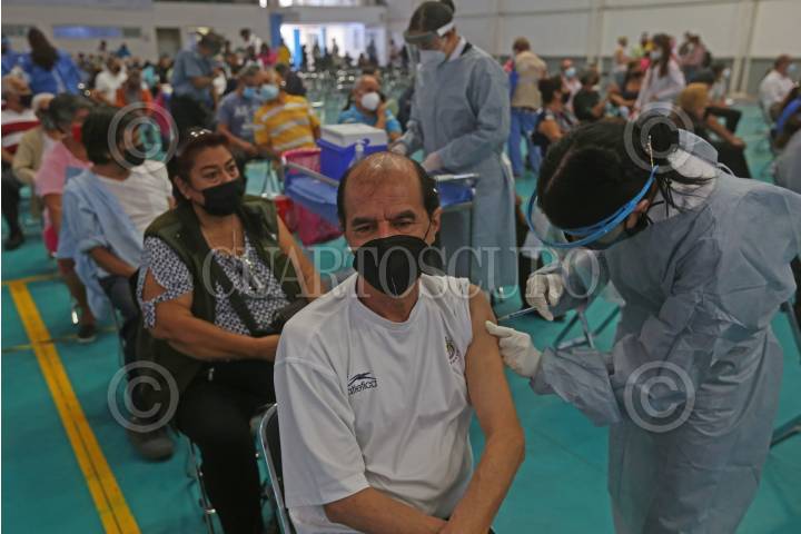 Personal encargado de la inmunización, aplica la vacuna contra Covid-19 a un hombre de la tercera edad en el modulo del Parque San Rafael.