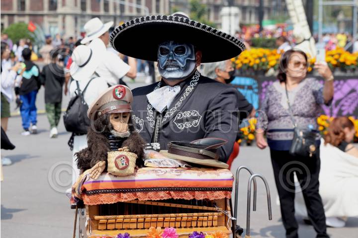 CIUDAD DE MÉXICO, 01NOVIEMBRE2024. Visitantes pasean por la mega ofrenda instalada en el zócalo capitalino. Un organillero pintado de esqueleto se encuentra en la Mega Ofrenda del zócalo atrayendo a turistas y paseantes. FOTO: EDGAR NEGRETE LIRA/CUARTOSCURO.COM
