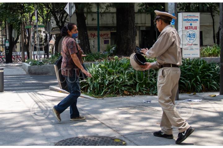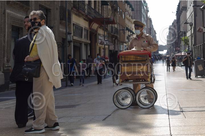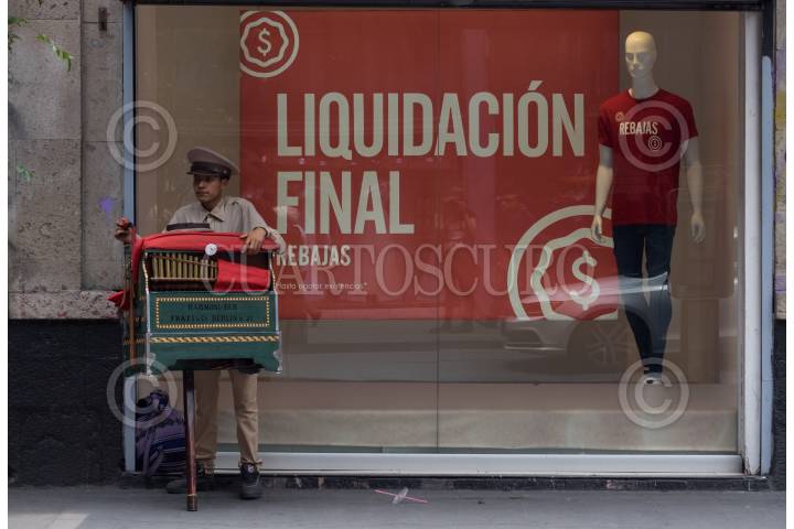 Un organillero ofrece sus notas musicales en la calle de Madero, en donde la mayoría de los negocios han bajado sus cortinas tras la declaratoria de emergencia nacional por la pandemia de Covid-19
