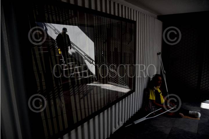 Una persona baja las escaleras de uno de los accesos del metro de HIdalgo, mientras otra persona en muletas permanece en espera de recolectar algunas monedas.
