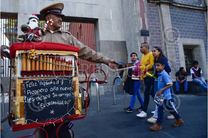 Un organillero toca y pide algunas monedas sobre Avenida Juárez, mientras su instrumento de trabajo presenta adornos por la festividad de Navidad.