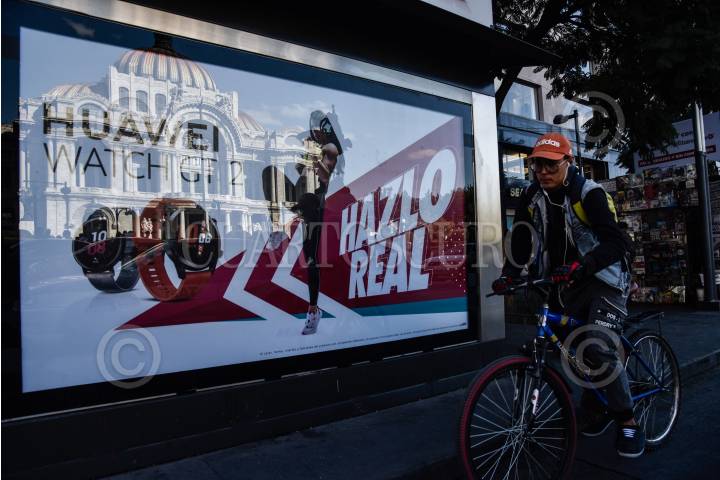 Un ciclista transita sobre avenida Juárez mientras el Palacio de Bellas Artes se refleja en un anuncio publicitario.