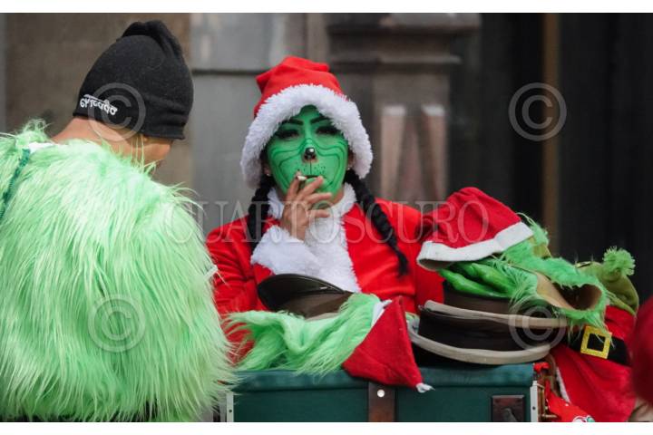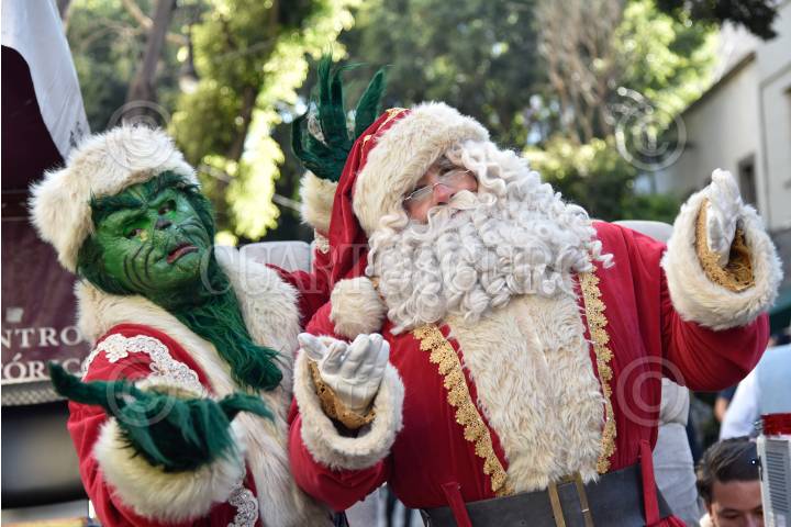 Dos personas disfrazados de "El Grinch" y "Santa Claus" posan sobre la calle Francisco I. Madero en el centro de la ciudad.