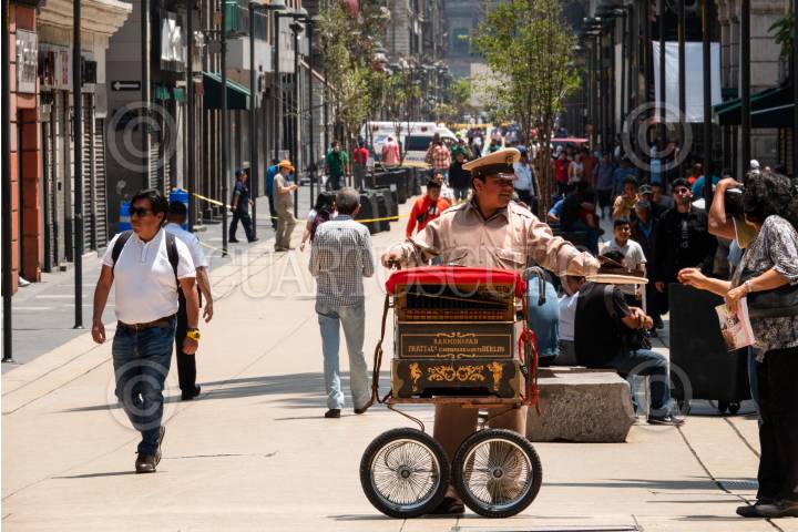 Un organillero toca algunas piezas para ganarse unas monedas en la avenida 5 de Mayo, en el Centro Histórico.