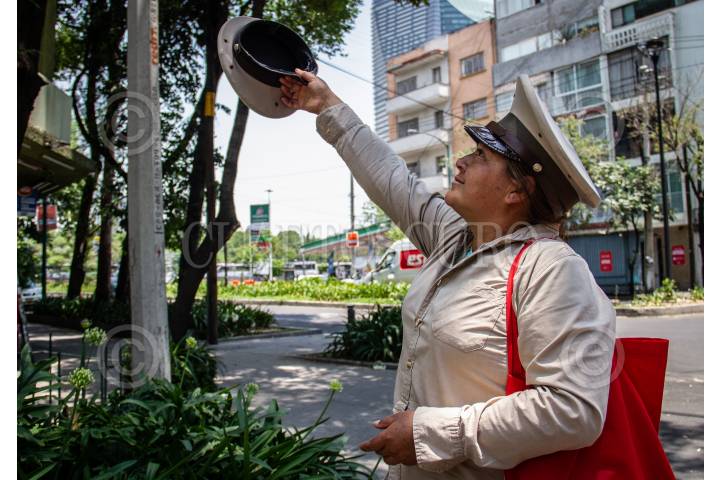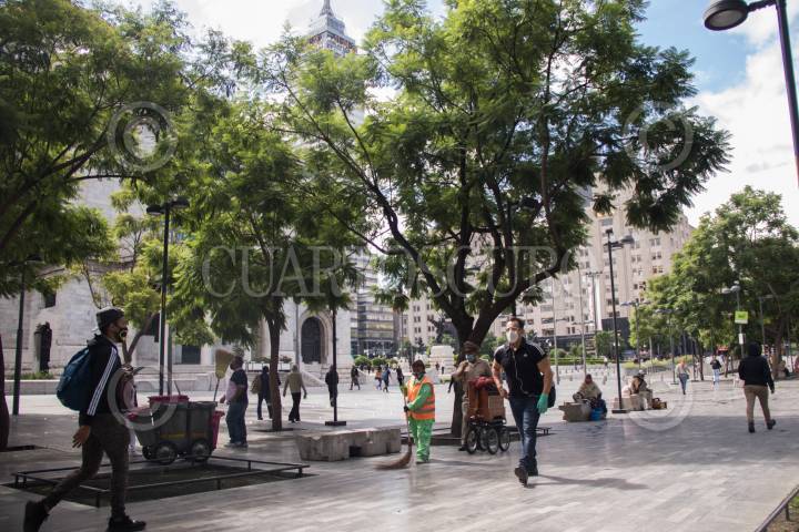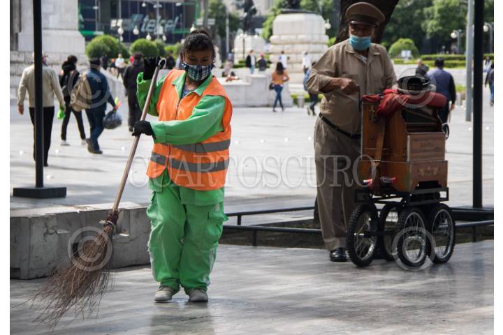 Explanada de la Alameda Central que comparte con el Palacio de Bellas Artes. Trabajadores de limpieza, Organilleros y vendedores confluyen en este espacio público.