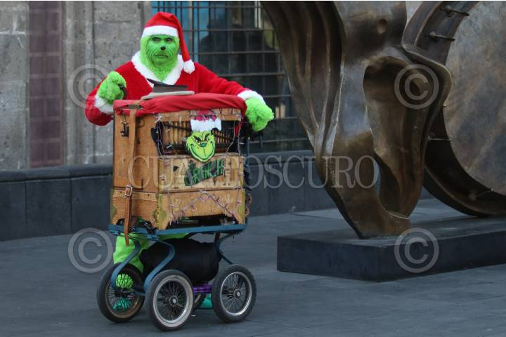 Un organillero caracterizado del personaje "Grinch" toca melodías para ganarse unas monedas en Avenida Juárez, en el Centro Histórico