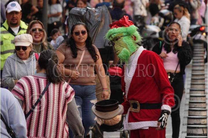 CIUDAD DE MÉXICO, 03DICIEMBRE2024.- Un organilleros disfrazados de Santa Claus y mascara de Grinch pide unas monedas a los transeúntes en el Centro Histórico. FOTO: GRACIELA LÓPEZ/CUARTOSCURO.COM