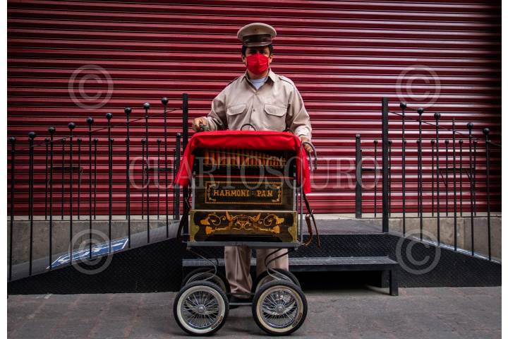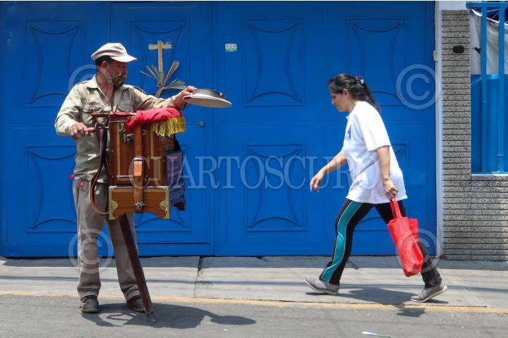 Un organillero toca melodías para ganarse unas monedas en la calle de Puente Titla