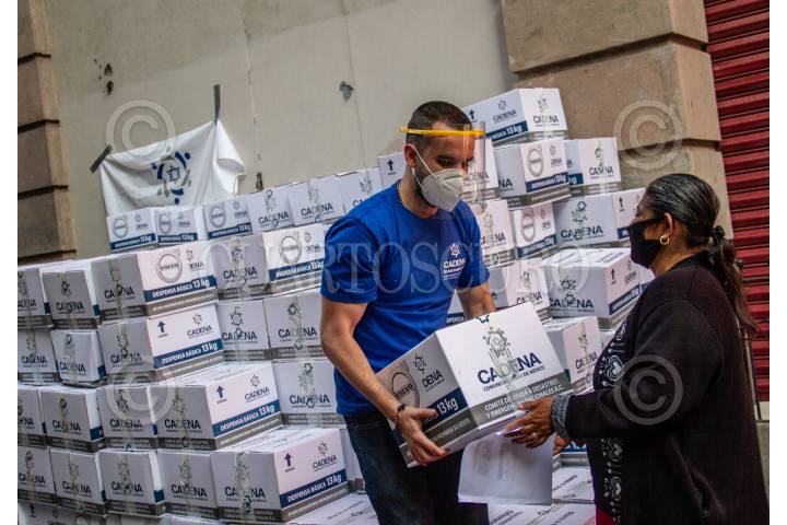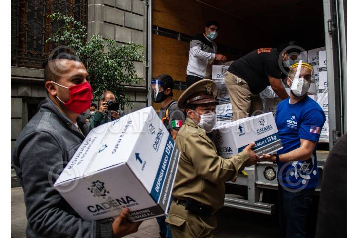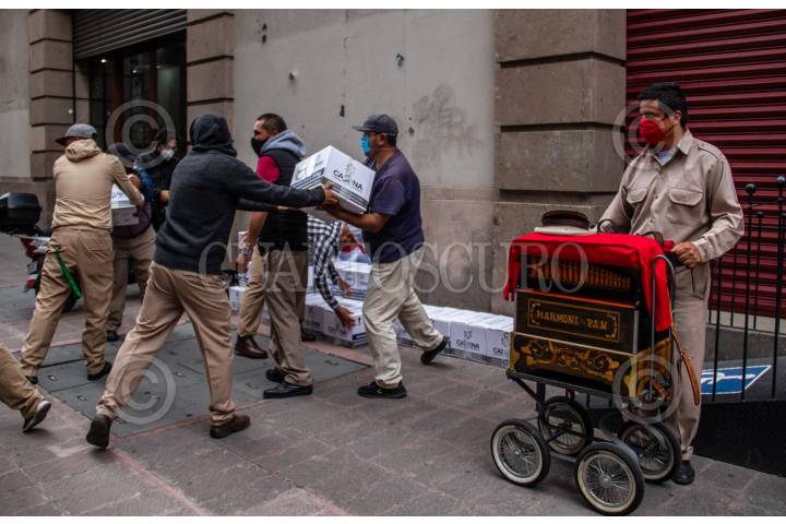 Organilleros de la Ciudad, ayudan a descargar las cajas de donación de despensas por parte de asociaciones cíviles