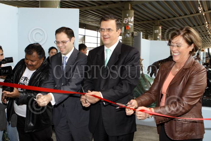 MÉXICO, D.F., 09JULIO2010.- Agustín Estrada, director de FARO de Oriente; Alfonso Miranda, director del Museo Soumaya y Fundación Carlos Slim; Marcelo Ebrard, jefe de gobierno del D.F.; y Elena Cepeda de León, secretaria de Cultura durante el corte inaugural de la exposición “Del Mito al Sueño… Dalí a Rodin” que se realizo en la Fabrica de Artes y Oficios (FARO) de Oriente. FOTO: RODOLFO ANGULO/CUARTOSCURO.COM