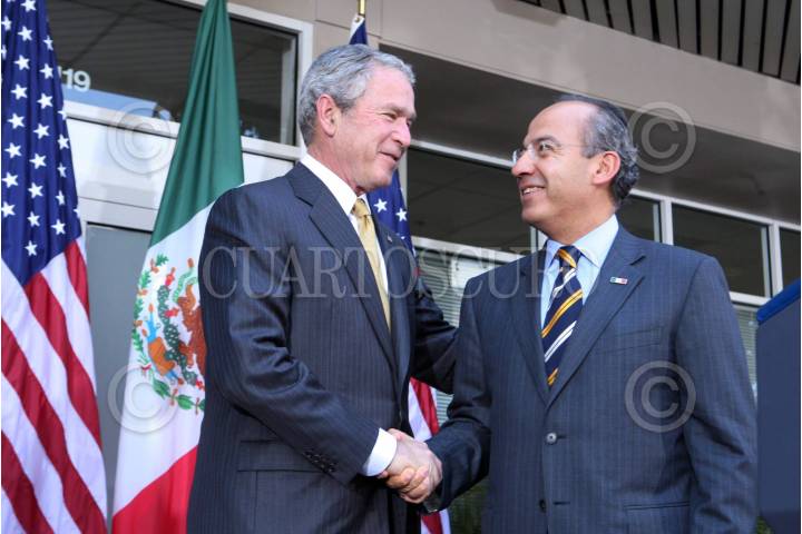 NUEVA ORLEANS, LUISIANA, 21ABRIL2008.- El presidente de México, Felipe Calderón Hinojosa, acompañado del presidente de Estados Unidos George W. Bush, durante la inauguración de la nueva sede del consulado de México en Nueva Orleans. FOTO: ALFREDO GUERRERO/CUARTOSCURO.COM