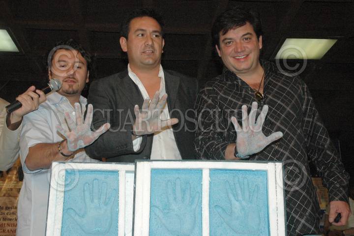 MEXICO, D.F. 26AGOSTO2005.- Luis Carlos Monroy, Raùl Ornelas y Jaime Flores, del grupo "3 de Copas" plasmaron las huellas de sus manos en Galerías, la Plaza de las Estrellas. FOTO: Iván Stephens/CUARTOSCURO.COM