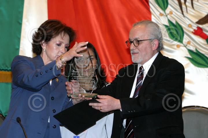 MEXICO, D.F., 26ABRIL2006.- Jesús Blancornelas, director del semanario Z de Tijuana, recibió un reconocimiento por su trayectoria por parte de la Cámara de Diputados, se lo entregó Marcela González Salas, presidenta de la mesa directiva. FOTO: Moisés Pablo/CUARTOSCURO.COM