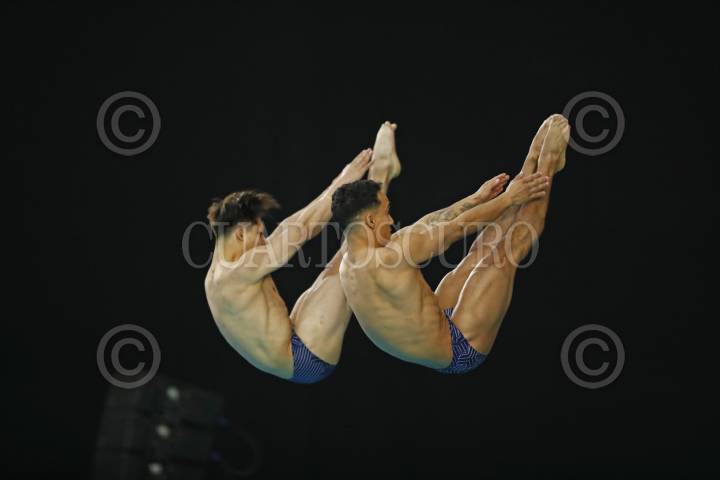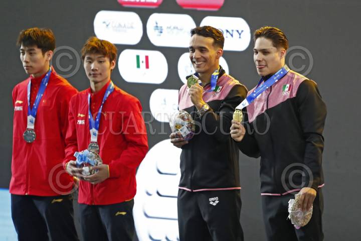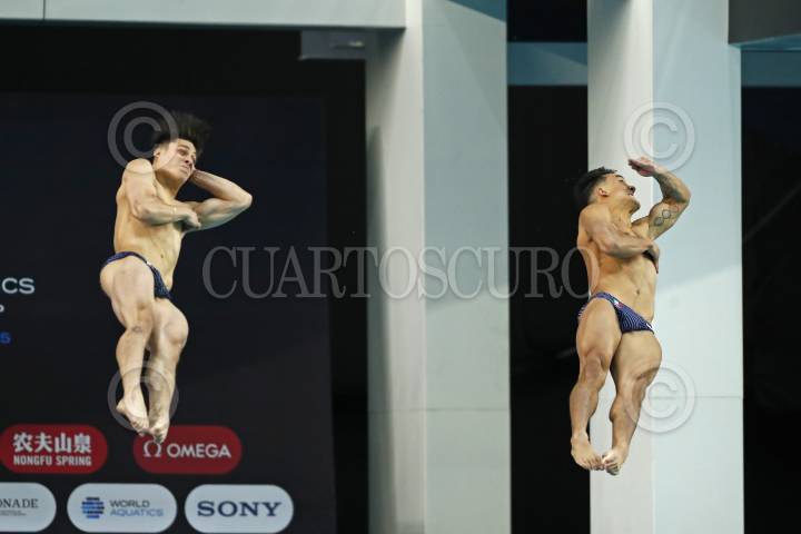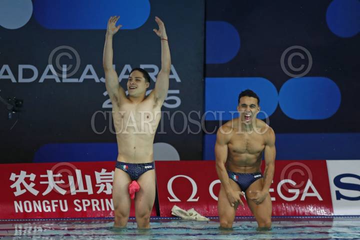 ZAPOPAN, JALISCO. 06ABRIL2025.- Hoy en el Centro Acuático Metropolitano y durante la justa deportiva del Mundial de Clavados Guadalajara 2025, se llevo a cabo la final en Trampolín de 3 metros sincronizado varonil, en donde los mexicanos Osmar Olvera y Juan Manuel Celaya termino en 1er lugar, consiguiendo así la medalla de Oro para su país. FOTO: FERNANDO CARRANZA GARCIA / CUARTOSCURO.COM