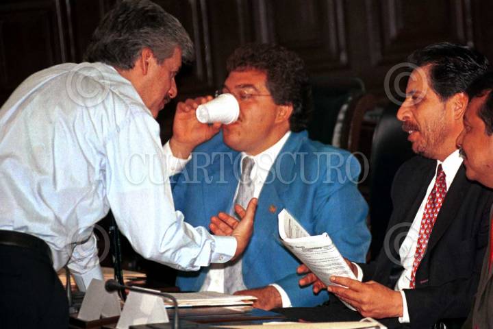 Marti Batres y Jesús Ortega, líderes parlamentarios del PRD platican durante un receso en la sesión de la Comisión Permanente que se realiza en el Senado de la República. FOTO:Oswaldo Ramírez/CUARTOSCURO.COM