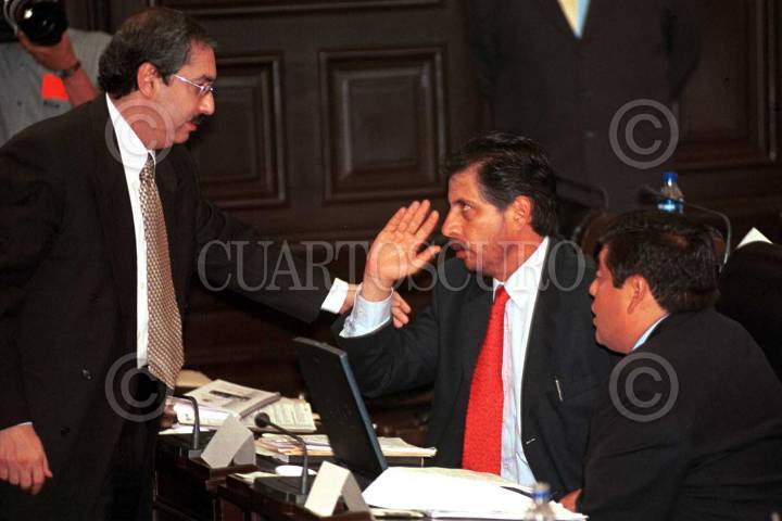 Los legisladores José Natividad González Paras, del PRI, y Jesús Ortega, del PRD, dialogan durante la sesión efectuada por la Comisión Permanente, en la cual se emitió un punto de acuerdo para mandar una carta al gobernador de Texas, Rick Perry, con el fin de evitar la ejecucción de Javier Suárez Medina. FOTO: Oswaldo Ramírez/CUARTOSCURO.COM