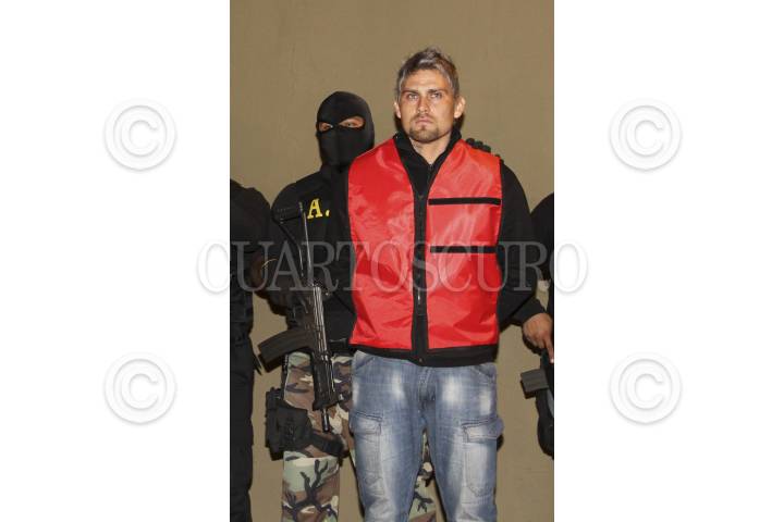 MONTERREY, NUEVO LEÓN, 07ENERO2012.- El ex-portero de los Rayados del Monterrey, Omar "El Gato" Ortíz, fue presentado por la Procuraduria General de Justicia del Estado, como miembro de una banda de secuestradores, ligada al Cártel de Golfo en la zona sur de Nuevo León. Ademas fueron capturados, César Acosta y Luis Alberto González con quien realizaron por lo menos 20 secuestros, por lo que obtuvieron al menos 20 millones de pesos como rescate, entre sus víctimas se encuentra el esposo de Gloria Trevi, plagiado el año pasado. FOTO: CUARTOSCURO.COM