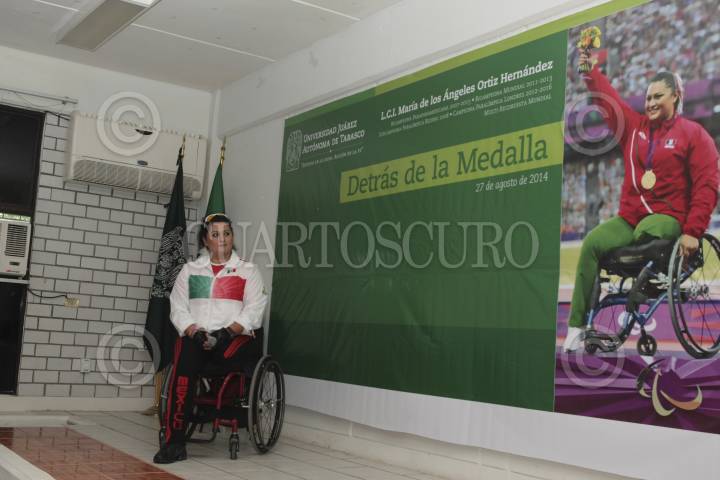 TENOSIQUE, TABASCO, 27AGOSTO2014.- María de los Ángeles Ortiz Hernández, campeona paralímpica y bicampeona mundialista ofreció una conferencia titulada “Detrás de la Medalla” en el auditorio universitario de la división de los Ríos de la UJAT. Ahí la campeona internacional dijo ante estudiantes que ya pensó en su retiro deportivo para este próximo 2016, dejando en claro que se siente demasiado satisfecha por todos los logros obtenidos por México y mexicanos. FOTO: MARCO POLO GUZMÁN HERNÁNDEZ /CUARTOSCURO.COM