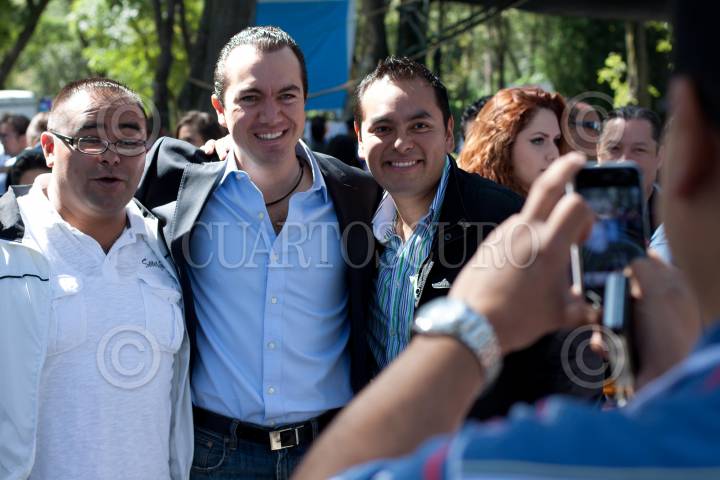 MÉXICO, D.F., 24MAYO2011.- Marcelo Ebrard Casaubón, Jefe de Gobierno del Distrito Federal; saluda a Mario Alberto Palacios, jefe delegacional en Benito Juárez; mientras los observa Carlos Orvañanos y Jorge Santillán; jefes delegacionales en Cuajimalpa y Álvaro Obregón; ésto durante la firma de convenio del Frente Común contra la extorsión, que fue encabezada por el Jefe de Gobierno. FOTO: MISAEL VALTIERRA/CUARTOSCURO.COM