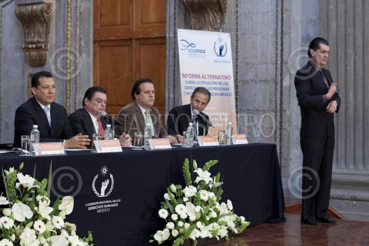 MÉXICO, D.F., 25OCTUBRE2011.- Raúl Plascencia Villanueva, presidente de la Comisión Nacional de Derechos Humanos, Federico Fleischman, presidente de Libre Acceso, Javier Quijano Orvañanos, presidente de CONIFE, y Federico Nuñez Perea, durante la Primera Jornada Nacional sobre Derechos Humanos y Personas con Discapacidad que se realizó en el edificio de la SEP. FOTOS: MOISÉS PABLO/CUARTOSCURO.COM