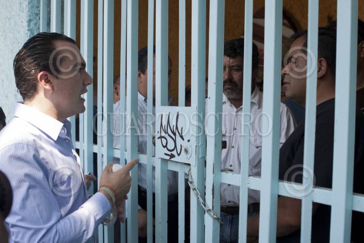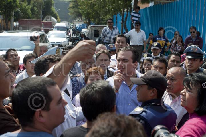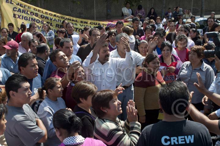 MÉXICO, D.F. 05NOVIEMBRE2011.- Un grupo de vecinos de la delegación Cuajimapla, protestaron afuera del deportivo "Huizachito", en donde el delegado Carlos Orvañanos encabezaba la develación de un busto en memoria de Juan Camilio Mouriño. Los inconformes se manifestaron por más seguridad y vivienda en sus colonias. FOTO: MOISÉS PABLO/CUARTOSCURO.COM